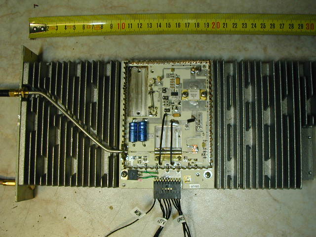 Diese Endstufe ist im Originalzustand für das 1800MHz GSM Mobilfunkband ausgelegt. Nach Austauschen einiger Chipkondensatoren gegen Saphirtrimmer, dem Abändern einiger Leitungen und Einbau eines 5V Spannungsreglers für die Basisvorspannung, kann die PA für das 23cm Amateurfunkband genutzt werden. Nach erfolgreichem Umbau sind bei 27V Betriebsspannung mit ca. 8-10W Ansteuerung eine Ausgangsleistung bis zu 60W zu erreichen. Wird auch das Treibermodul (MHW1815) modifiziert und wieder eingebaut, können bei einer Steuerleistung von nur 8mW satte 60W erreicht werden. |