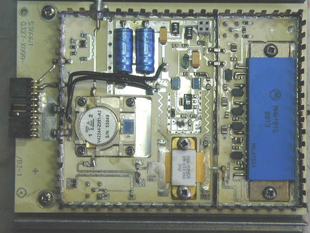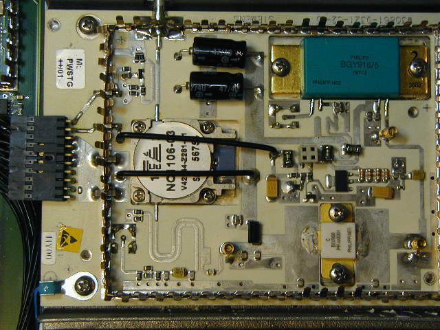IB 5,5-6,5A I ruhe ca. 0,35A P in max. 10W P out 60W Gewinn ca. 7,5dB bei 1,3GHz Option mit MHW1815: IB ges. 9A Iruhe ges. 1,2A P in max. 6-8mW Pout max. 60W Gewinn ca. 40dB bei 1,3GHz Das rechte Bild zeigt den Originalzustand für 1800MHz. |